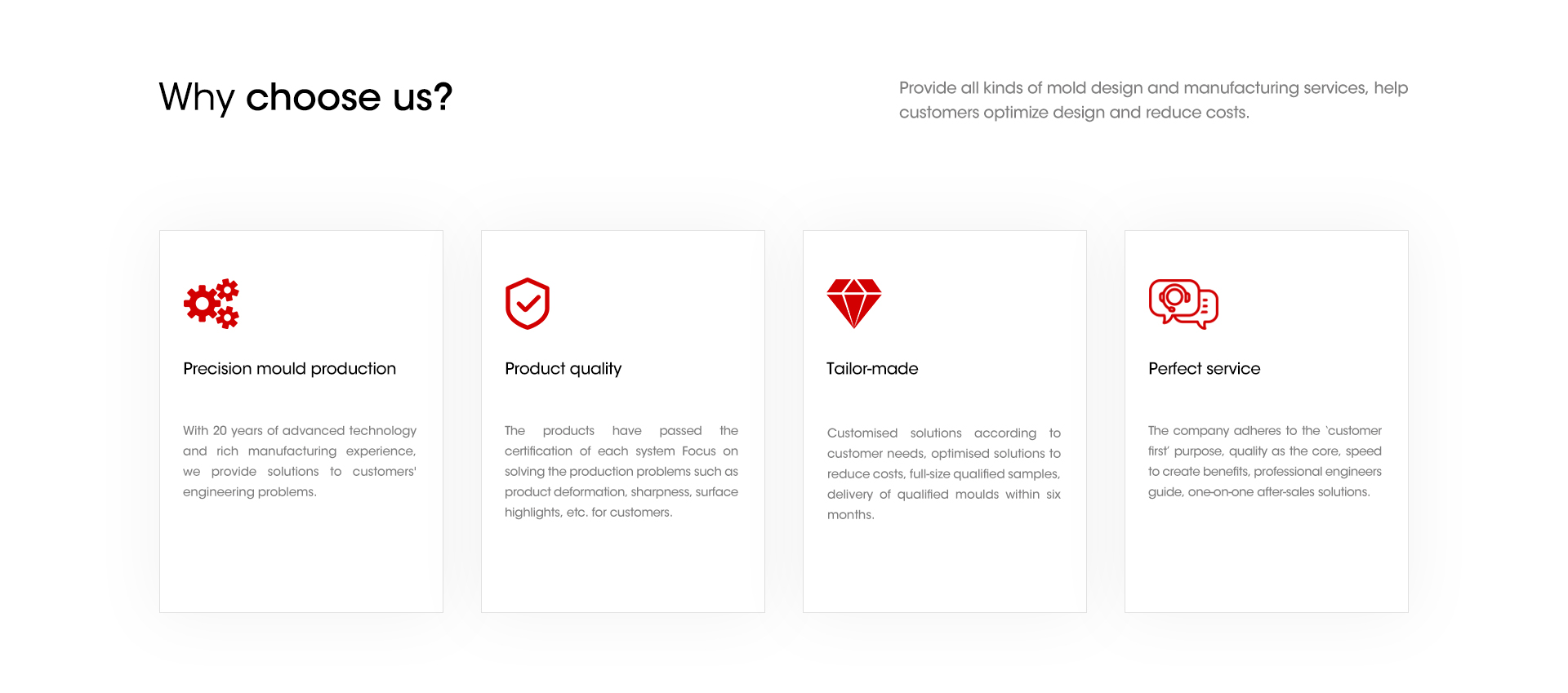 Dongguan Xianghui Technology Co., Ltd. in the era of the race against time, do craftsmanship polisher; in the endless river, in the heroes of the industry, integrity management, continuous innovation; the tide of the wind is sailing not forgetting the original intention of the dream line. Xianghui Technology Founded in 2017, is composed of mould industry elites with nearly 20 years of experience in mould manufacturing and design, with the concept of ‘technology manufacturing’, with mature mould technology, to solve engineering problems for customers, make technical analysis and provide solutions. Our product range covers various industries such as home appliances, automotive, industrial, medical, electronics, machinery and so on...